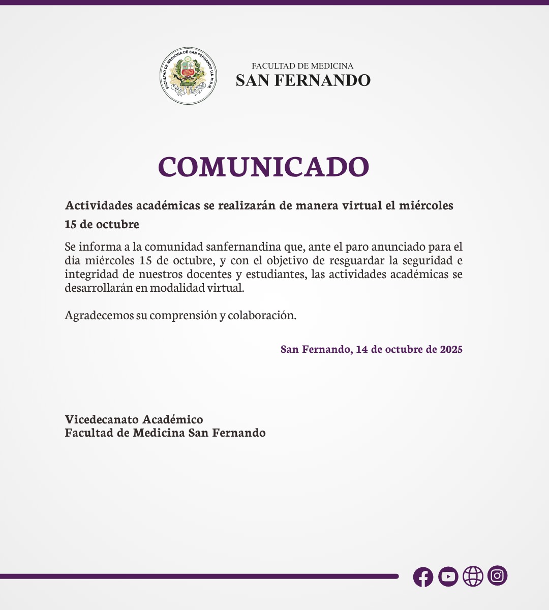 Actividades académicas se realizarán de manera virtual el miércoles 15 de octubre