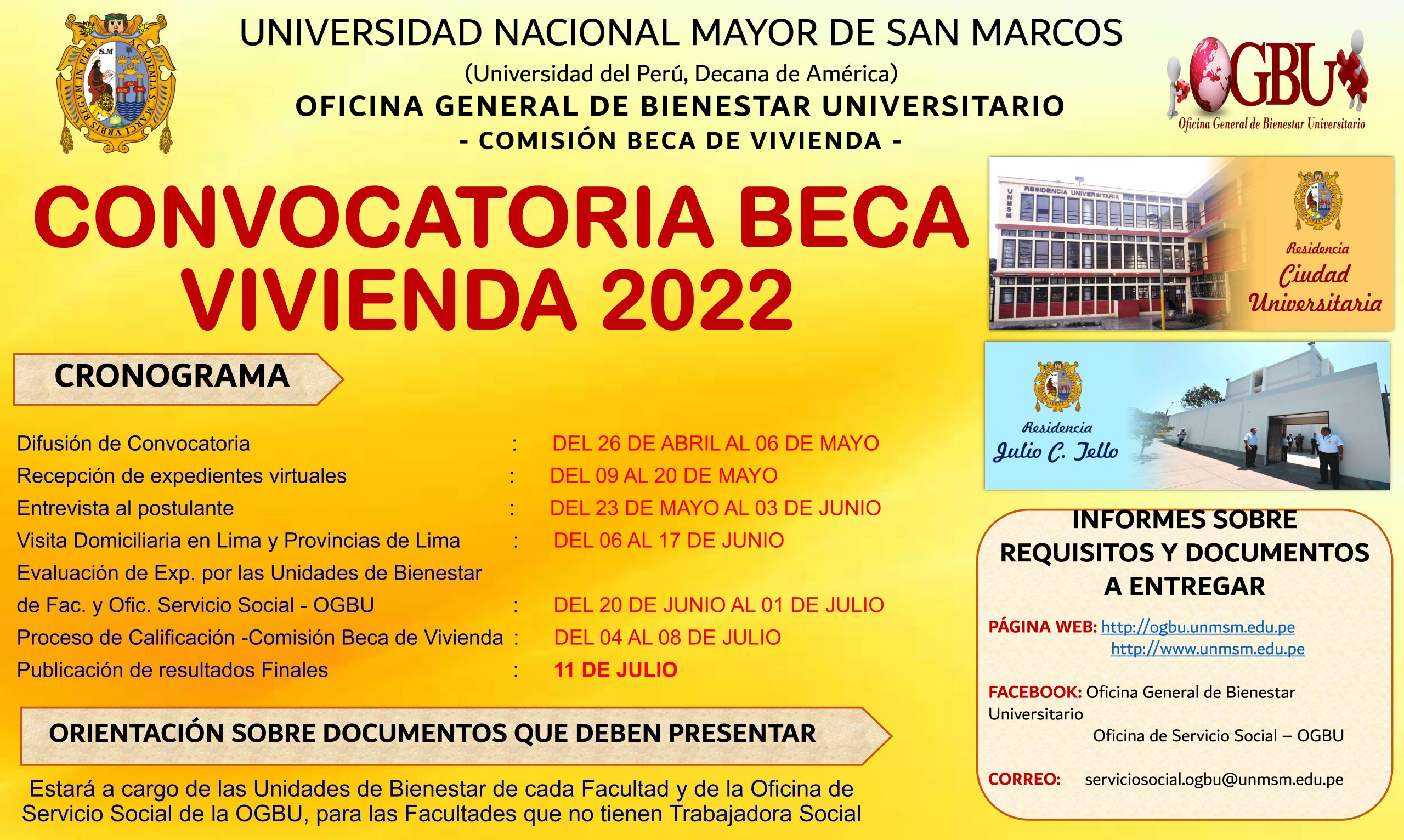 Convocatoria Beca de Vivienda 2022 publicado por Unidad de Estadística e Informática Fecha 18/04/2022Ver y descargar:Cronograma, Requisitos y Documentos a presentar.Solicitud y Formato del Postulante.Compartir: Unidad de Estadística e Informática Publicación anterior Curso de Capacitación Docente 2022: "Desafíos de la enseñanza en los nuevos ambientes de aprendizaje" 18/04/2022Siguiente publicación Sesión de Pósteres 2022 - PAMS 18/04/2022También te puede interesar Convocatoria, Cronograma y Cuadro de Plazas Vacantes para la Promoción Docente 2025 de la Universidad Nacional Mayor de San Marcos 4 diciembre, 2025 Actividades académicas se realizarán de manera virtual el martes 14 de noviembre 13 noviembre, 2025 Actividades académicas se realizarán de manera virtual el martes 04 de noviembre 3 noviembre, 2025