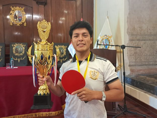 La Facultad de Medicina felicita a nuestros representantes sanfernandinos Félix Cutisaca Tacora y Fabiana Mena Muñoz, quienes fueron homenajeados en el Centro Cultural de San Marcos tras obtener el primer puesto en los Juegos Florales Julia Sánchez Deza 2025, en la disciplina de tenis de mesa.