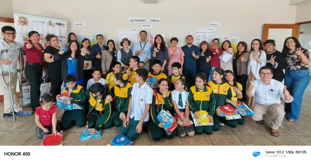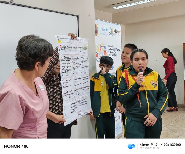 El taller permitió aplicar dinámicas diversas que permitieron que 15 niños, niñas y adolescentes del 6to de primaria de la IE “Héroes del Cenepa” entre otros actores relacionados con la promoción de la alimentación saludable y actividad física para niñas, niños y adolescentes (UNICEF, CENAN-INS, NIANP-UNMSM, Municipalidad de Breña, C.S. Pérez Carranza, y C.S. Max Arias Schreiber) prototipen y testeen las ideas desarrolladas por los niños, niñas y adolescentes, para lograr que se alimenten saludablemente y practiquen mas actividad física.