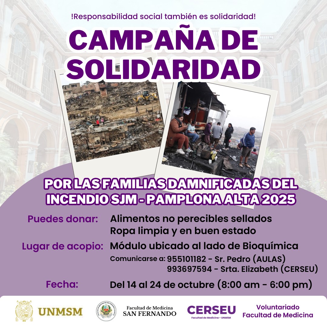 La Facultad de Medicina invita a toda la comunidad sanfernandina a sumarse a la Campaña de Solidaridad en apoyo a las familias damnificadas por el incendio ocurrido en Pamplona Alta – San Juan de Miraflores 2025. Esta iniciativa busca brindar ayuda humanitaria a quienes han perdido sus viviendas y pertenencias a causa de este lamentable suceso.