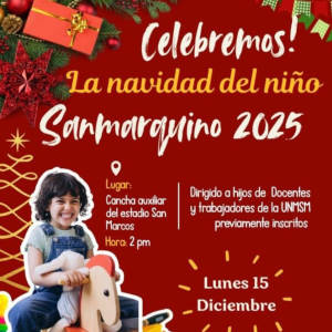 Celebremos “La navidad del niƱo Sanmarquino 2025”Dirigido a hijos de Docentes y trabajadores de la UNMSM previamente inscritos. 15 Dic2:00 PM Cancha auxiliar del Estadio San Marcos
